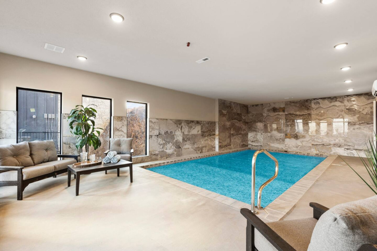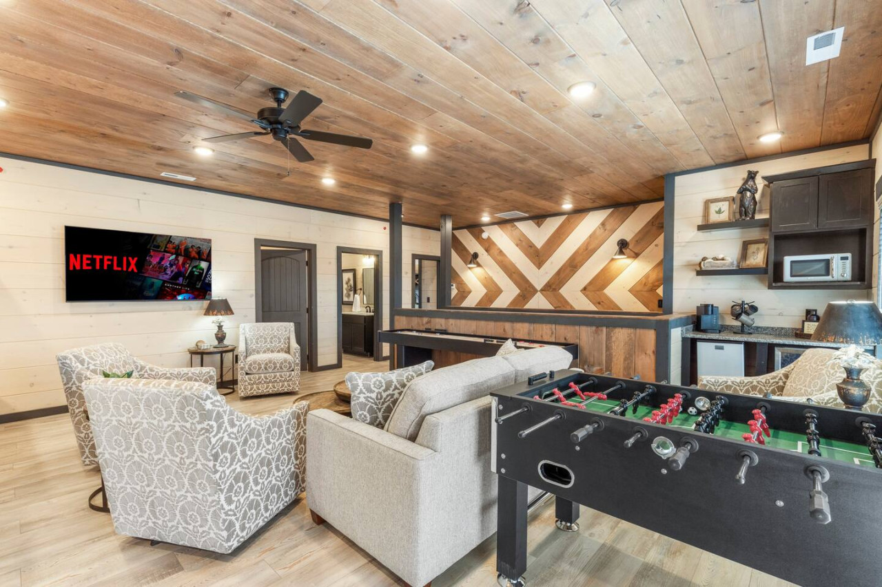 Step inside to mountain charm and contemporary elegance. The heart of the cabin is the spacious living room, where plush sofas surround a central fireplace, casting a warm, inviting glow. Adjacent is the gourmet kitchen, a haven for culinary enthusiasts. Downstairs, indulge in the tranquil waters of the indoor heated pool, surrounded by ample natural light filtering through expansive windows. Challenge loved ones to a game of shuffleboard in the game room or retreat to the dedicated theater room for unforgettable movie nights. Free Wi-Fi is available throughout.