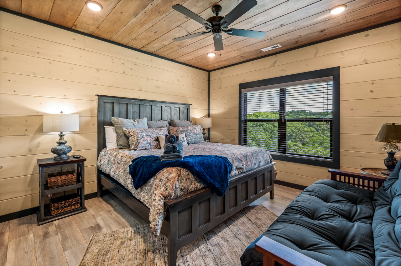 ✔ Bedroom #2 (Main Level): King-sized Bed, Futon, Flat-screen TV, Attached Full Bathroom with Stand Up Shower